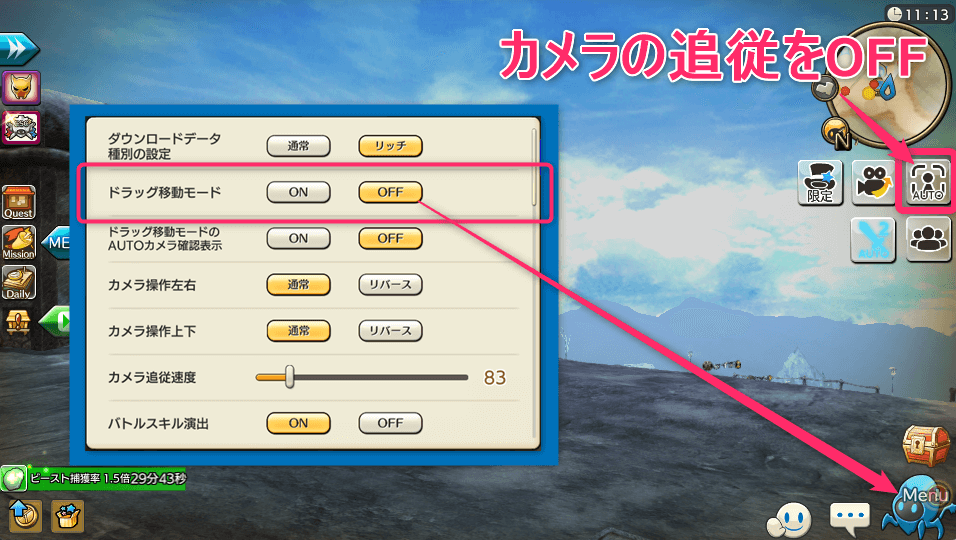 フィールド画面上のドラック移動モードのAUTOをOFF