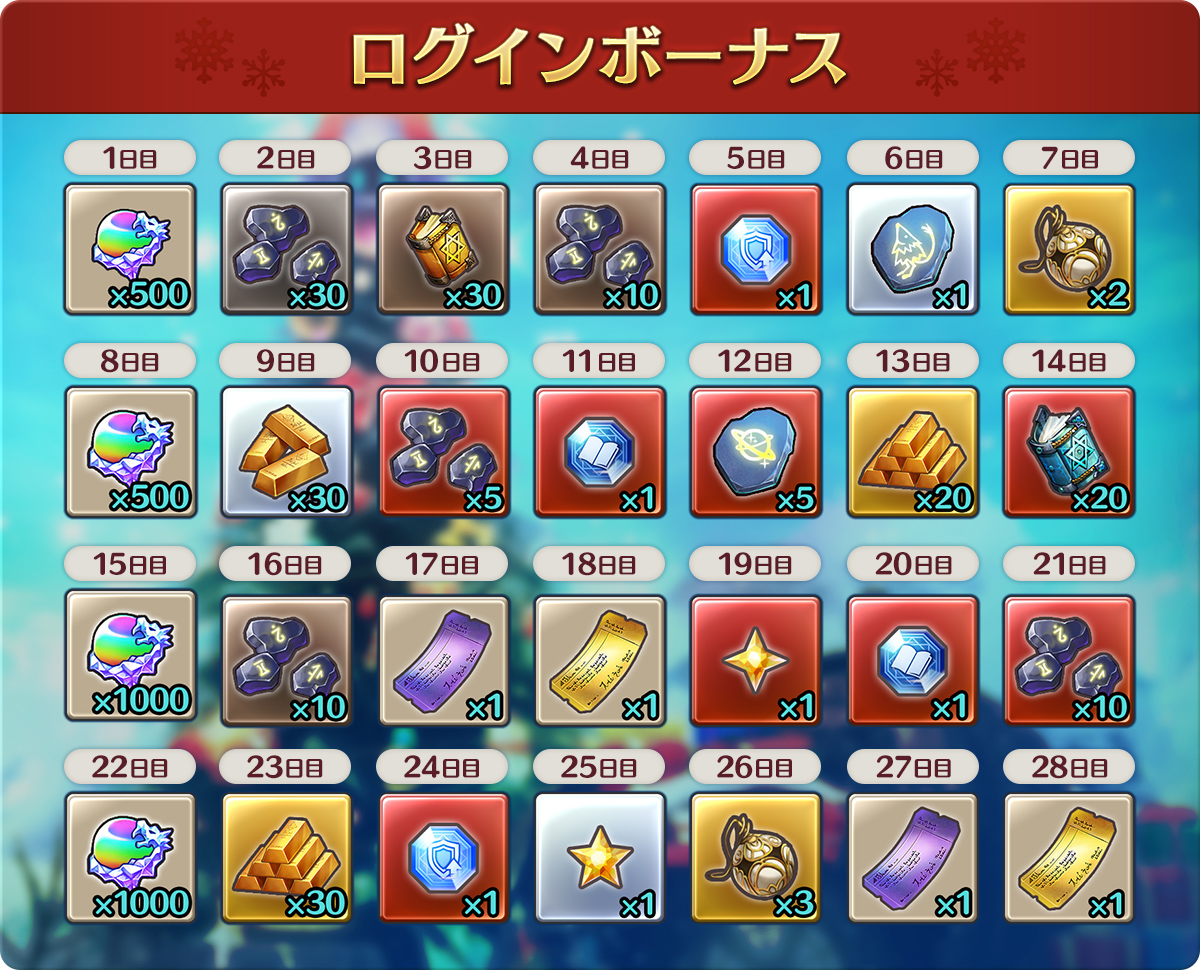 12/14(火)メンテナンス開始までクリスマスベル 12/14(火)メンテナンス終了後~12/28(火)メンテナンス開始まで 各達成報酬