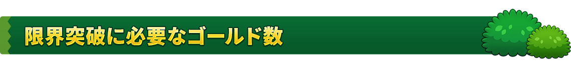 限界突破 ゴールド数 30→31 100,000G→30,000G31→32 200,000G→60,000G32→33 300,000G→90,000G33→34 400,000G→120,000G34→35 500,000G→150,000G35→36 600,000G→180,000G36→37 700,000G→210,000G37→38 800,000G→240,000G38→39 900,000G→270,000G39→40 1,000,000G→300,000G