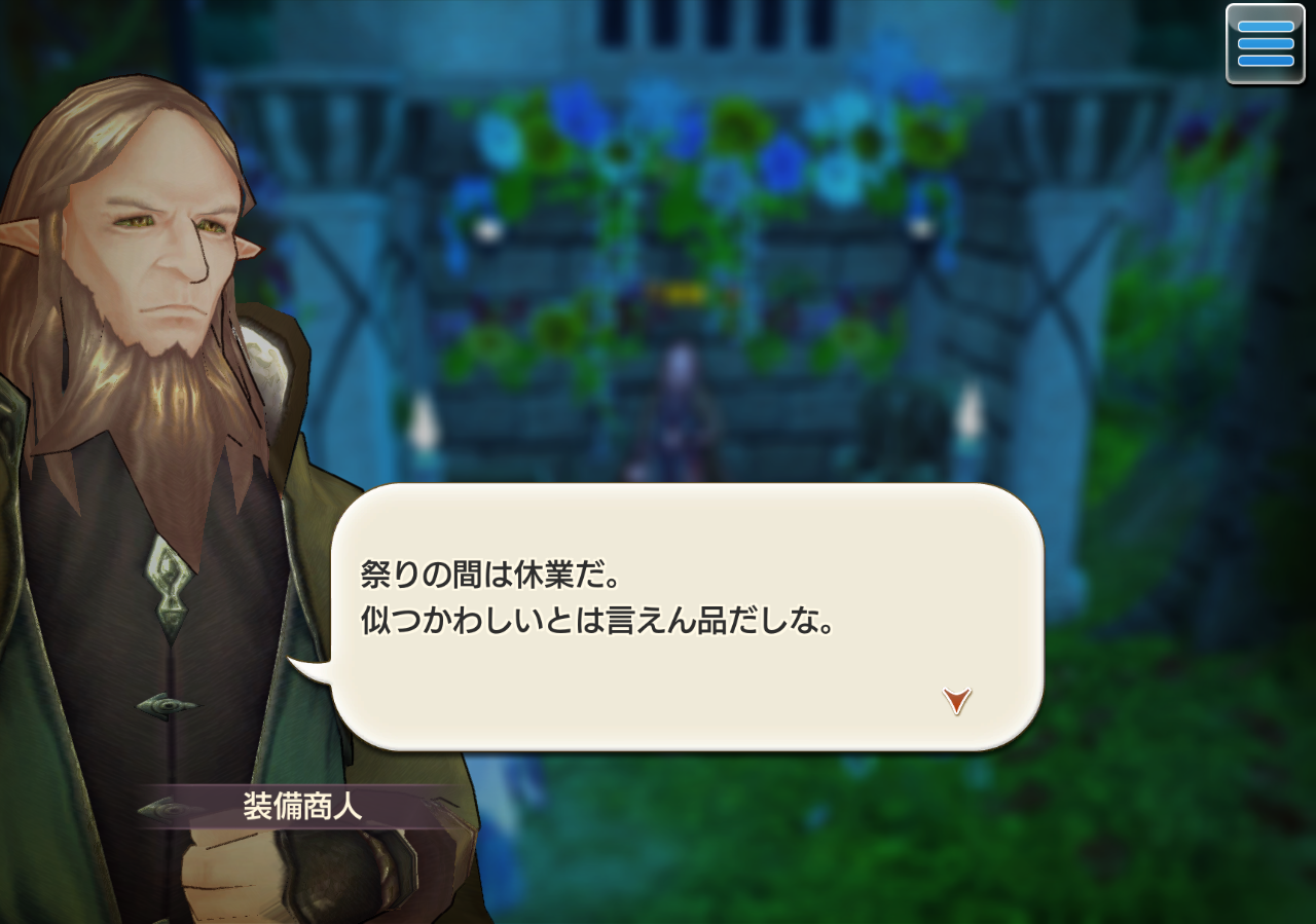 2021/09/04 21:57 公開 祭日は休業 雑日誌 スクリーンショット 村の道具屋と装備屋で売っているものを確認した時の出来事→道具屋:祭りの間は商売なし。→装備屋:祭りの間は休業だ。じゃ~なんで店にいるの・・・・。 ^^; miya リンクをコピーしました 前の旅日誌 旅日誌一覧 次の旅日誌 コメント