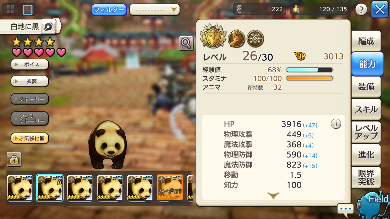 気を取り直して最大値ボーナス予想です。パンダは星2がいない為星3Lv1のステータスを1.5で割ってざっくりとした予想とします。以下となりました。