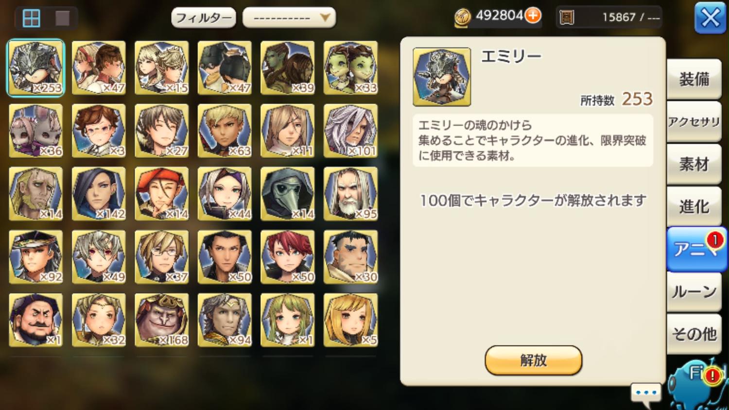 前回のウォルリック・エミリーガチャで大量に集まったエミリーアニマに、今回のアニマがプラスされました。