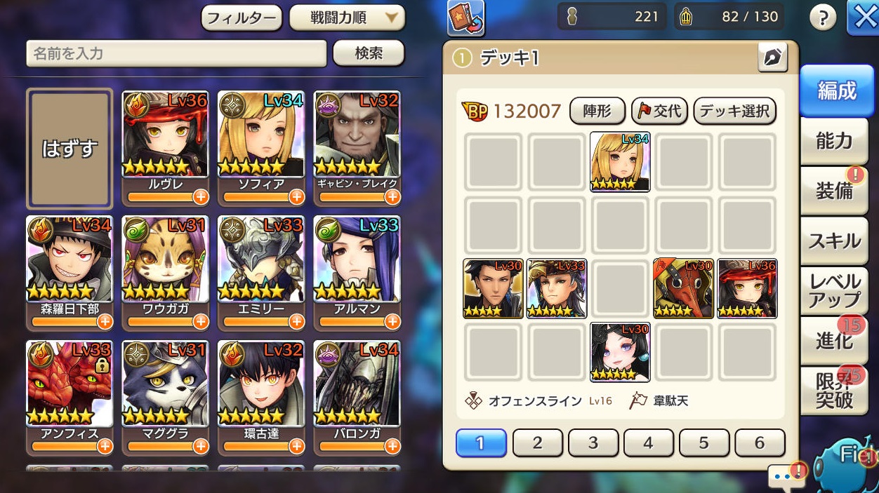 後衛乙りまくったので陣形をピラミッドからオフェンスラインへ変更。オフェンスだと開始直後に両端に攻撃が来るので、耐えることのできるキャラを配置しなくてはならない。