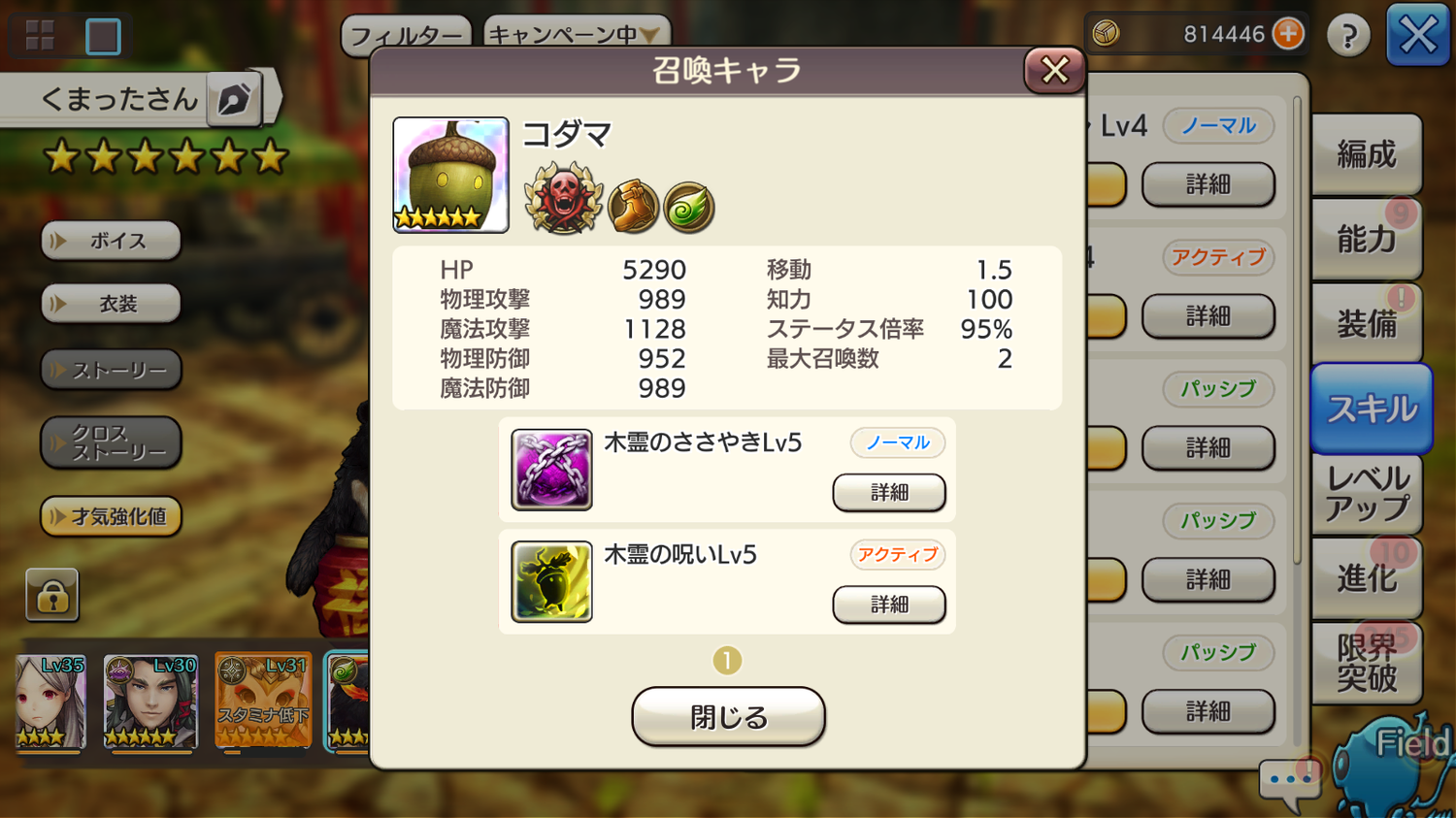 召喚するコダマは最初からなぜかスキル5。コダマは初期CTはないっぽい