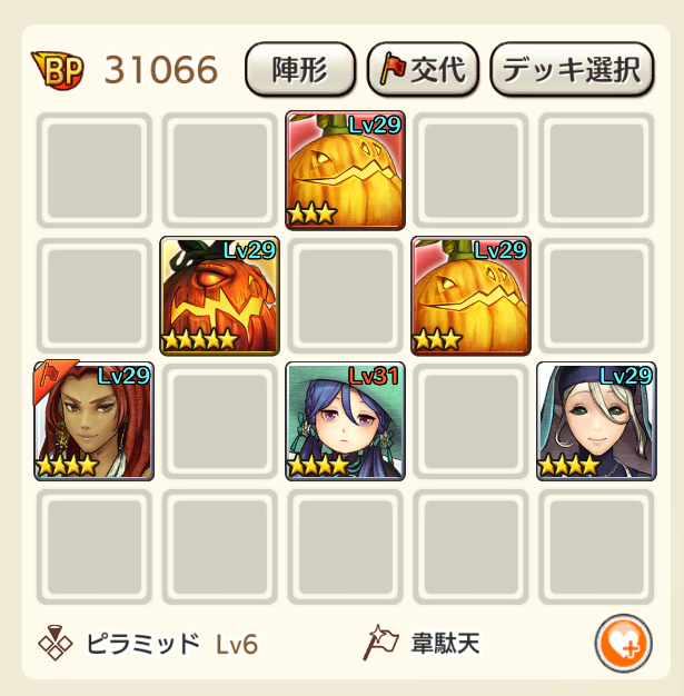 魚や両生類は苦手なのでこいつ1択なかぼちゃ頭氏。他にもCT減らすロロミュやアリアロとかクイックかけるとかでもやれますし、スキルレベル5にしたらチャージも早くなるしで最終的には1体でも倒せるようにはなりますが、生涯1回しか使わないのにそんなに手間かけられるかっていう問題も・・・w今年のハロウィンで功労賞代わりに☆6にしてあげたパンプキン頭氏