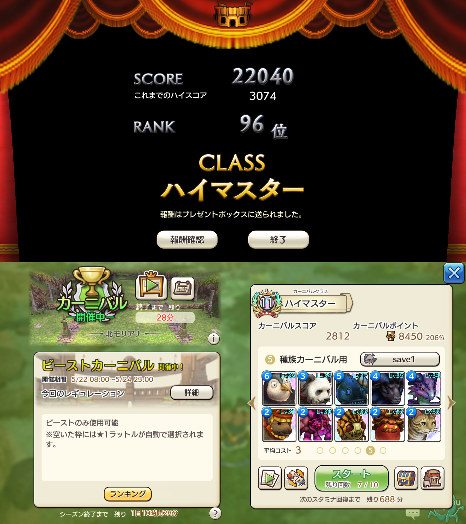 今回はフンボルト、ケープペンギン、モモンガに苦戦したカーニバルでした。フンボルトコスト2ありえへんわ_(:3 」∠)_