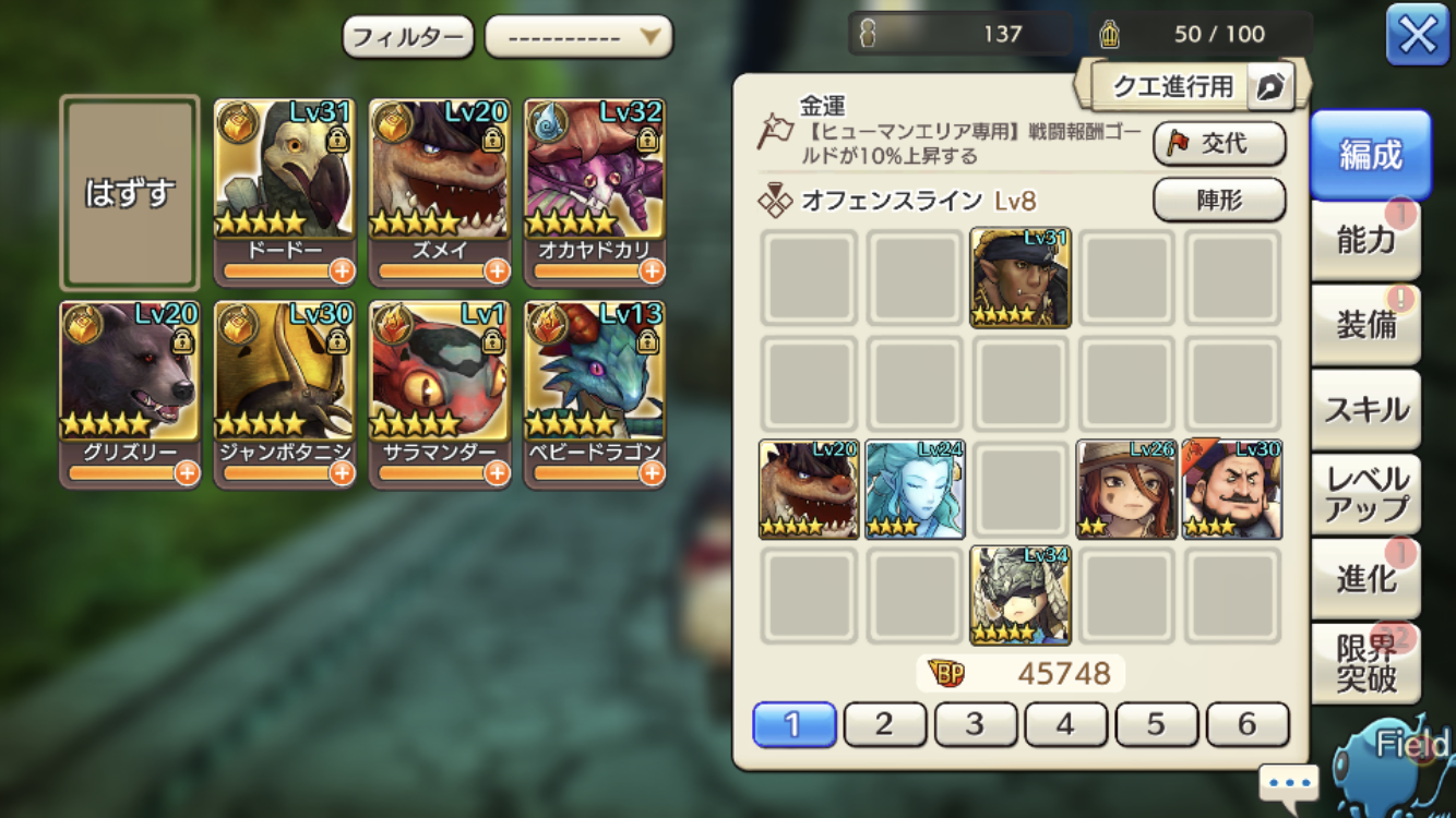 最初は相手が4人だけで楽勝に思えたのですが、敵リーダーが増援するごとに2人ずつ増え、4人増えた時点で、わたしのタンクは床ゴロンになります。増援さえなければ、どうってことないのですが、ポアトト作戦も開幕リーダー殲滅作戦もうまくいきません。クエBPも75000と高いですし、諦めかなぁと思いました。