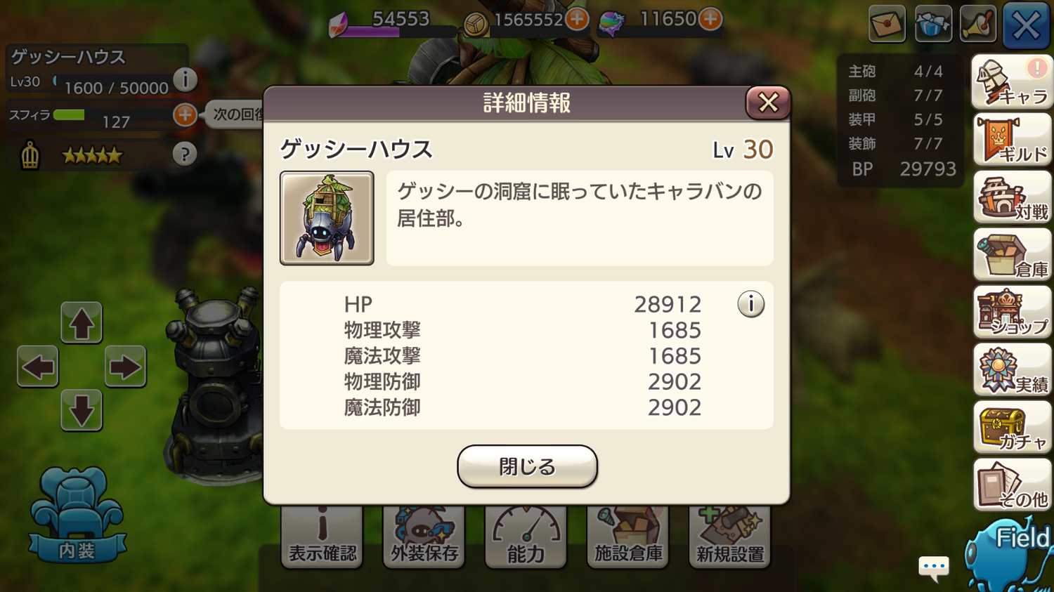 何はともあれ内装あと1個を10→11に上げれば30になるってところでメンテ直前になったので、次の強化を開始せずメンテ後に条件緩和されたビースト倉庫Cを設置してすこし強化して、当面の目標であったLv30に届きました。