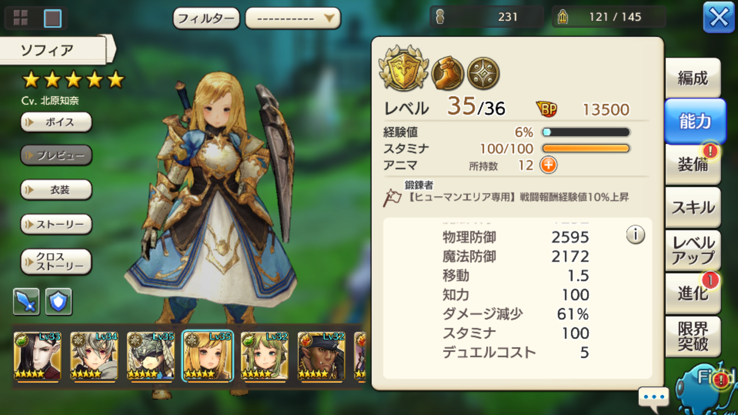 まずはウチのエースタンク、ソフィア様(Lv35ダメ減54%)を