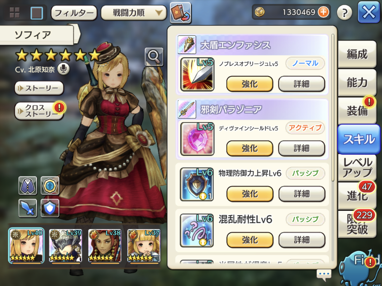 ◯6/6/6、レベル40、スキル上から5/5/6/6/5/5/5、BP32758、ただし補助装備は星4で埋め尽くされてる(>_<)…うむ!厳密にはカンスト手前なのかw