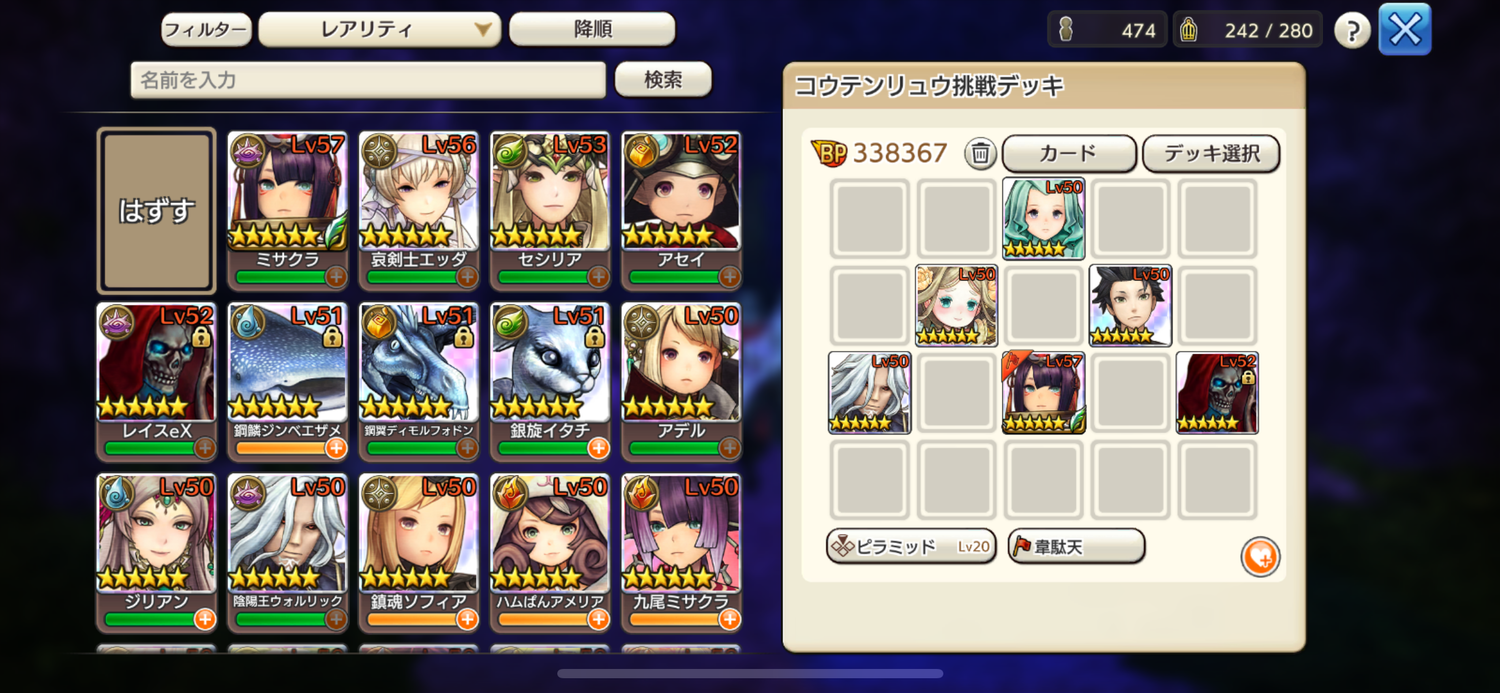 という事で今回はリベンジ!コウテンのヒップアタック?フットスタンプ?ですぐ退場するウチのイザイアさんに代わり、ミサクラ様の復帰です。火力4人、まとめ1、バッファー1の完全脳筋仕様となります!
