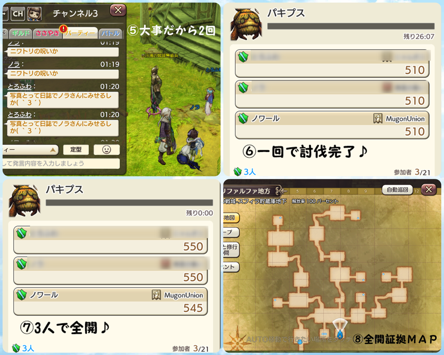 んで、また3人でPT組んで話してると、今度はとろふわさんにかな?お手伝いの希望のササが来たそうで、今度は私とノラさんでお手伝い。ノラさん2度目のフル稼働で申し訳ないけど、確実でお願いしたいからね・・ご苦労様です♪