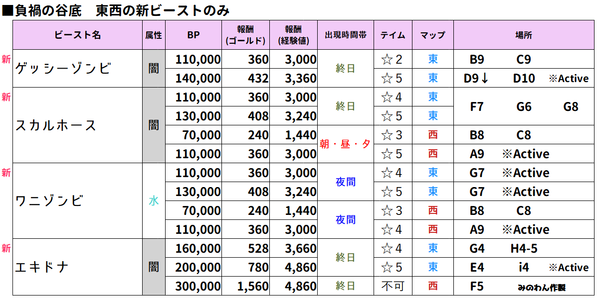 UPDATE 2023.10.18 07:00 東のゲッシーゾンビのテイム☆4→☆2修正