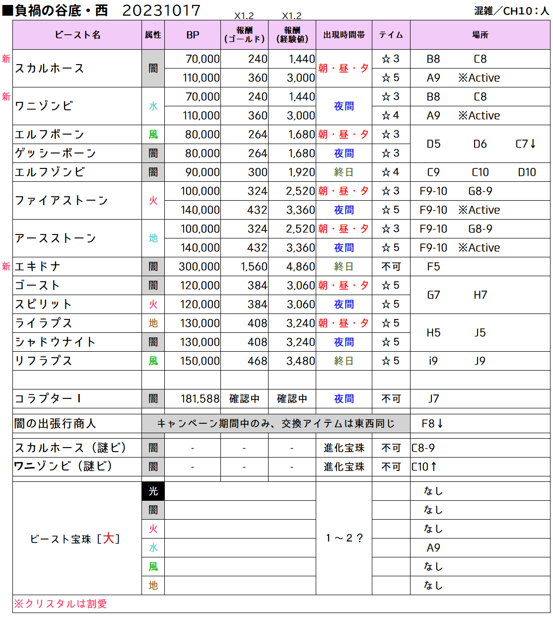 UPDATE 2023.10.17 19:10 西のみ先行して、コラプターI闇 追記と一部修正