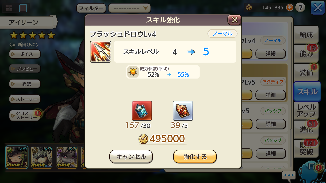 不具合報告送って良かった。ずっとLv4⇒Lv5の威力係数が52→53だったんですが、さすがに1%は低すぎるのでは?と思いあげれずにいたんですが、めでたくLv5にできました(^▽^)/ Lv1⇒Lv2の方は星5装備の時だろうけど全然気付かなかった。