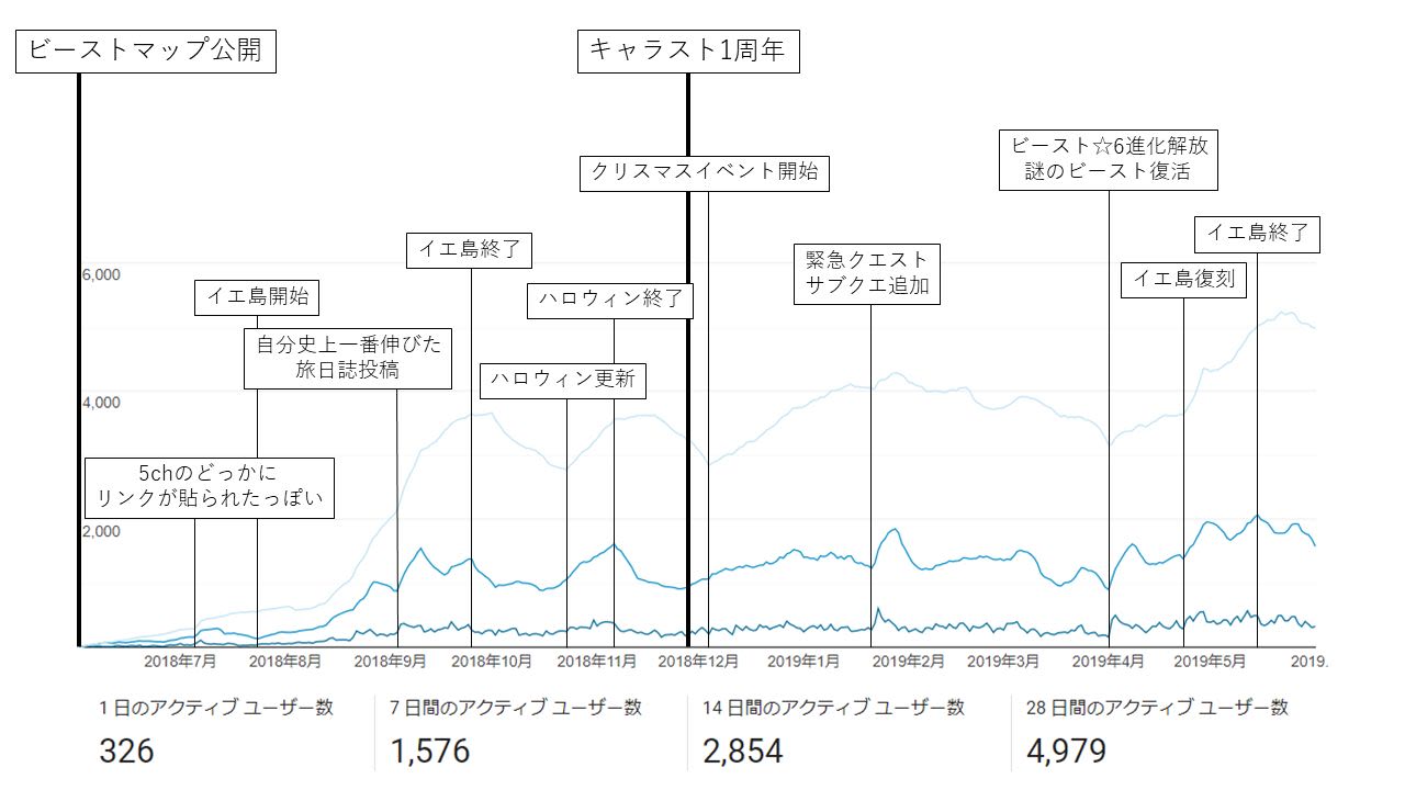 さて、回想に浸ってないでやりたいことを進めよう。1年経った時にずっとやりたかったことがあって、それは1年分のアクセスを見て、アクセスが増えた時期に何があったのかを見返すこと。このイベント伸びたよな、とか、めっちゃ減った時期あったよな、とか。そんなの。(画像参照)