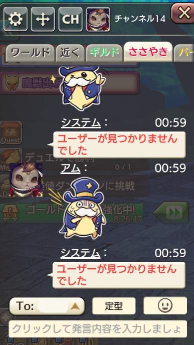 ささやきの対象がログアウト状態の場合 システムからの自動返答があります。
