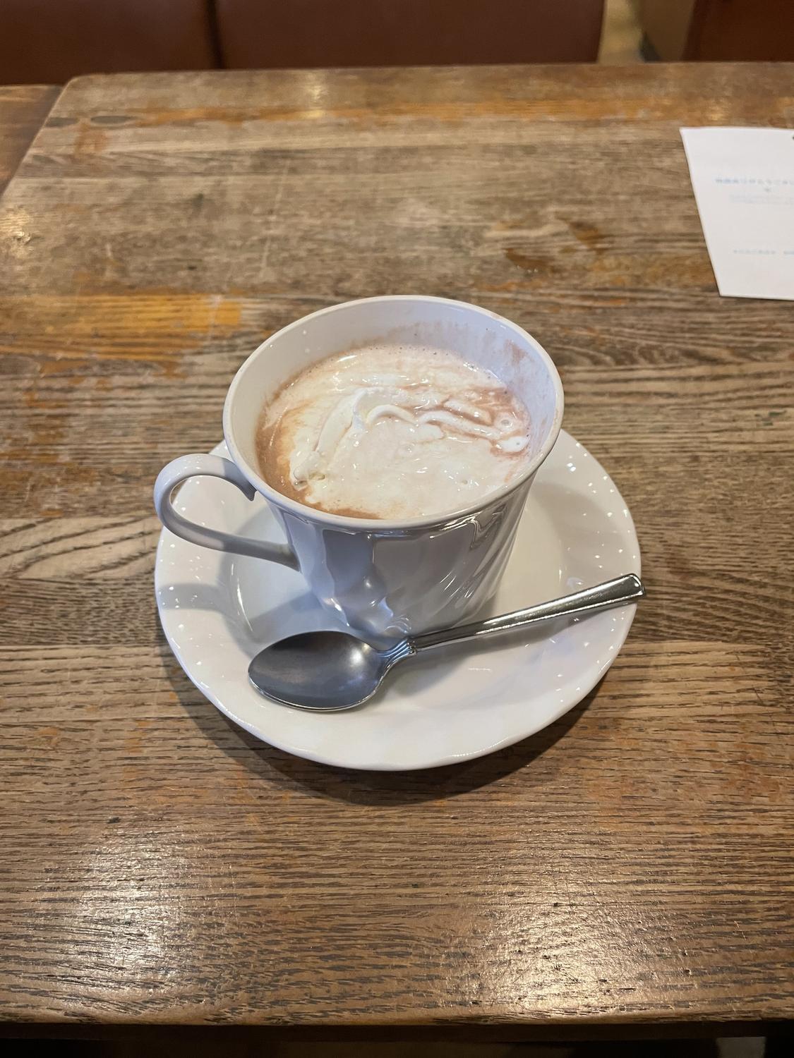 カフェでホットココアで〜す。