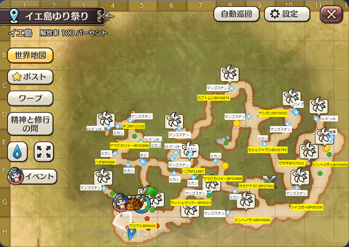 2020/04/08 21:52 公開 ビーストマップ(ゆり祭り/イエ島・イエ島北) スクリーンショット 始まりました!待ってたイエ島ゆり祭り(((o(*゚▽゚*)o)))久しぶりのイベマップに興奮して夜中走り回ったんですが…広い!!まだ2つしかマップが調べられませんでしたが、一応載せておきます(^^)vキャラバン素材は欠けたのが2個ずつ3か所、精巧なのが2個って感じで落ちてました。 シャサ リンクをコピーしました 前の旅日誌 旅日誌一覧 次の旅日誌 コメント 1 シャサ ID: ahizt6avf7fz もれを発見しましたm(__)mイエ島北のマップで、D6のちょっとへこんだ場所にカラッパが!!BP62563の大きいの1とBP34863の小さいの2がひっそりと存在していましたw 2020/04/11 01:29
