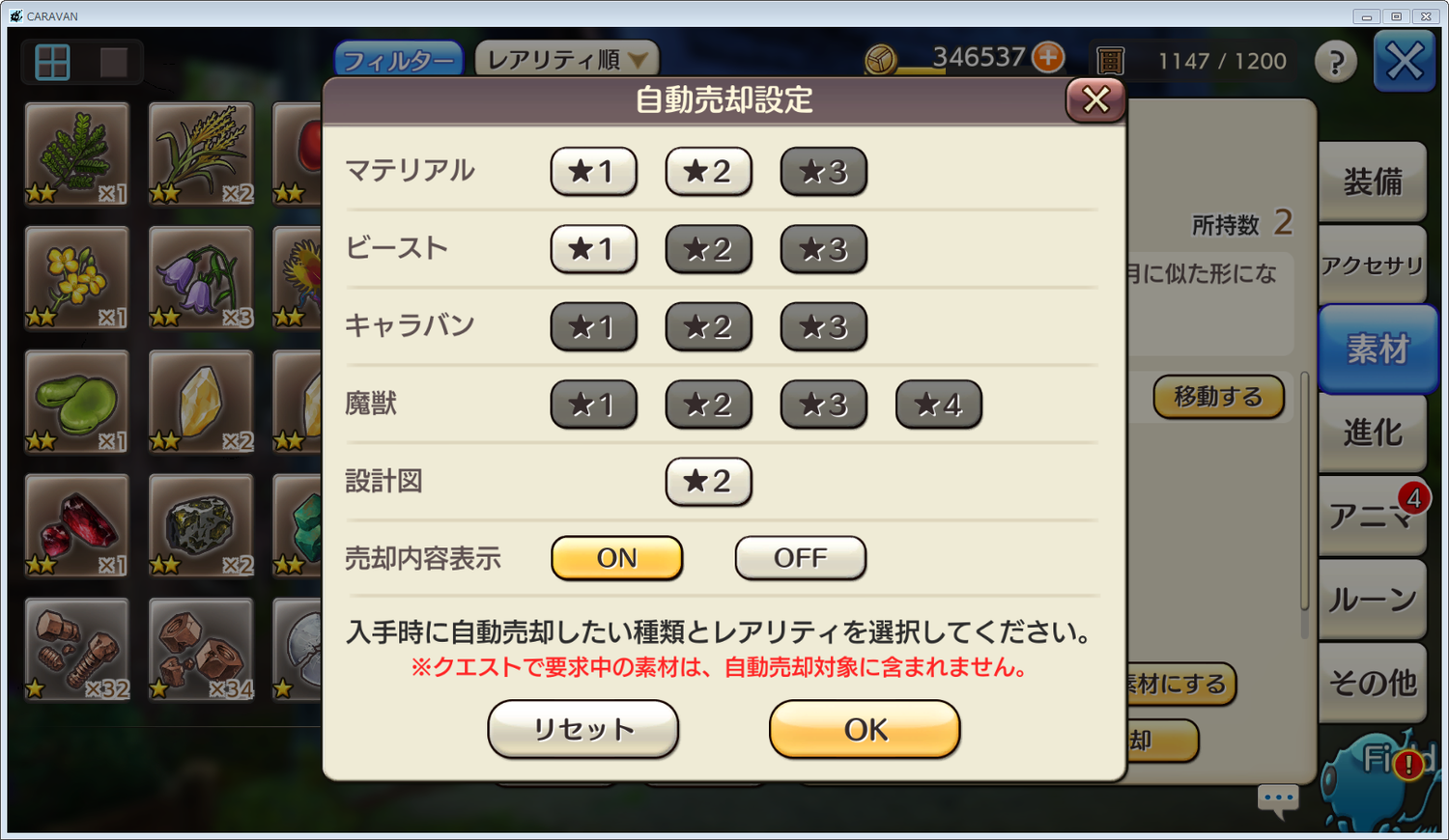 マテリアルは…設定しても現状は採取したときに売ってくれるわけでもないから無駄設定よなぁ…