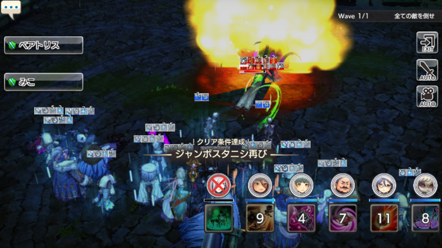 最初に全員を中央キャラバン付近に集め一回全員のアクティブをタニシに撃っておく。そうすると勝手に位置調整をしてくれるので。HPが削れてくるとタニシが増援、CT増加、ヒーリングを使ってきますが、増援の吹き出しのタイミングでバインド、たまにヴィンガで位置調整、以降「増援にバインド」が途切れないようにしながら他のアクティブをどんどん撃っていく感じでした。他の2人のスキルタイミングを見ながら、バインド2人は少しだけ温存してCT増加で撃てないことがないようにしていました。途中から動くなよ〜と思いながらガンガン撃ってましたが…( ̄▽ ̄;)あとタイミングがズレた時用壁役の骸骨を横から攻撃させようとしてヴェロニカさんを移動ミスさせてしまいました。無理に動かす必要なかったですね。