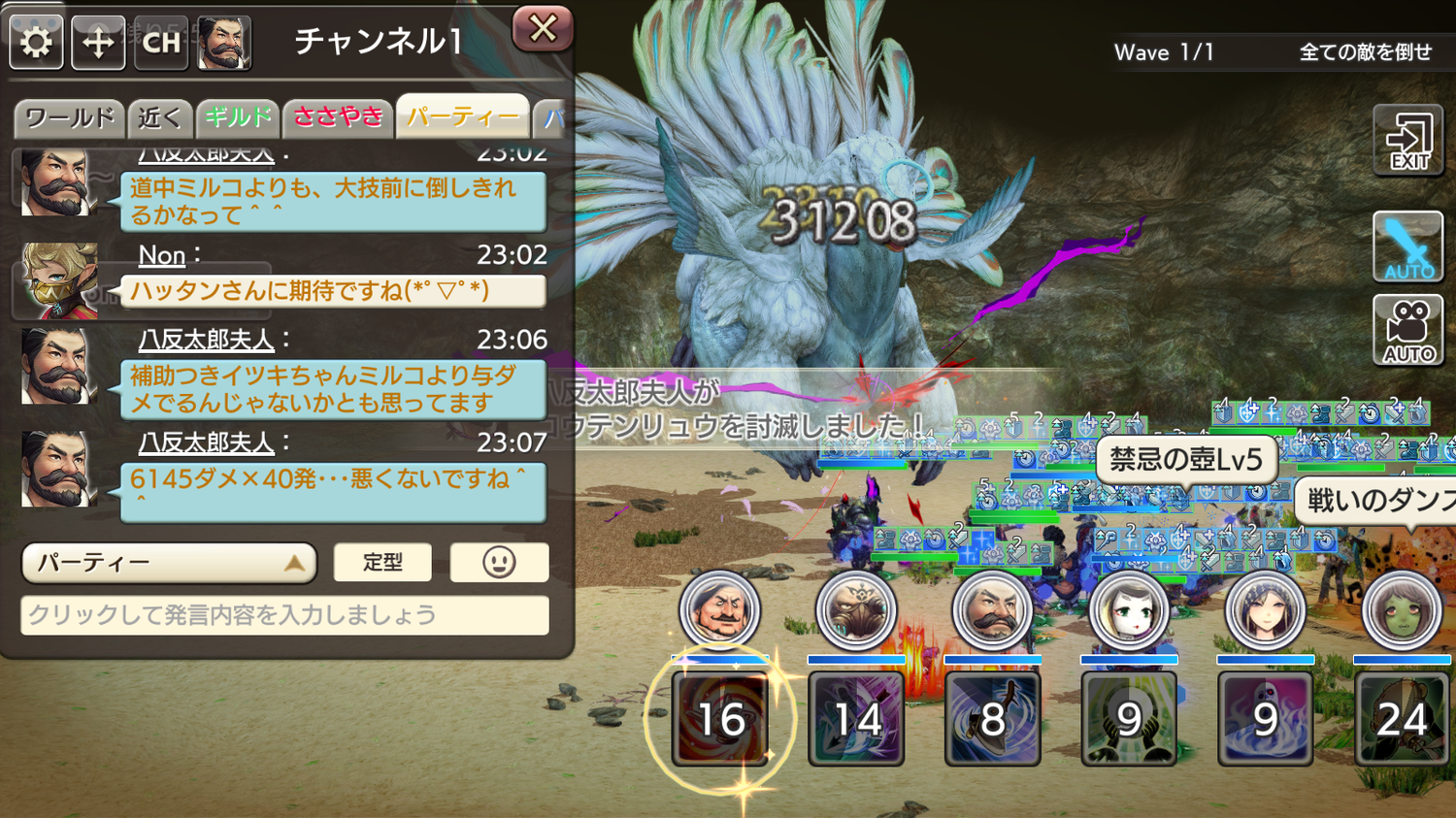 いつもだと道中まとめてドカンでミルコいれてたんですけど、コウテンリュウは1PTキル(大技使用前に倒しきる)のほうがいいだろうということで、私はミルコoutハッタンinさせました。今回は検証してみよぅ~ってナマイキなこと思っちゃったのです。