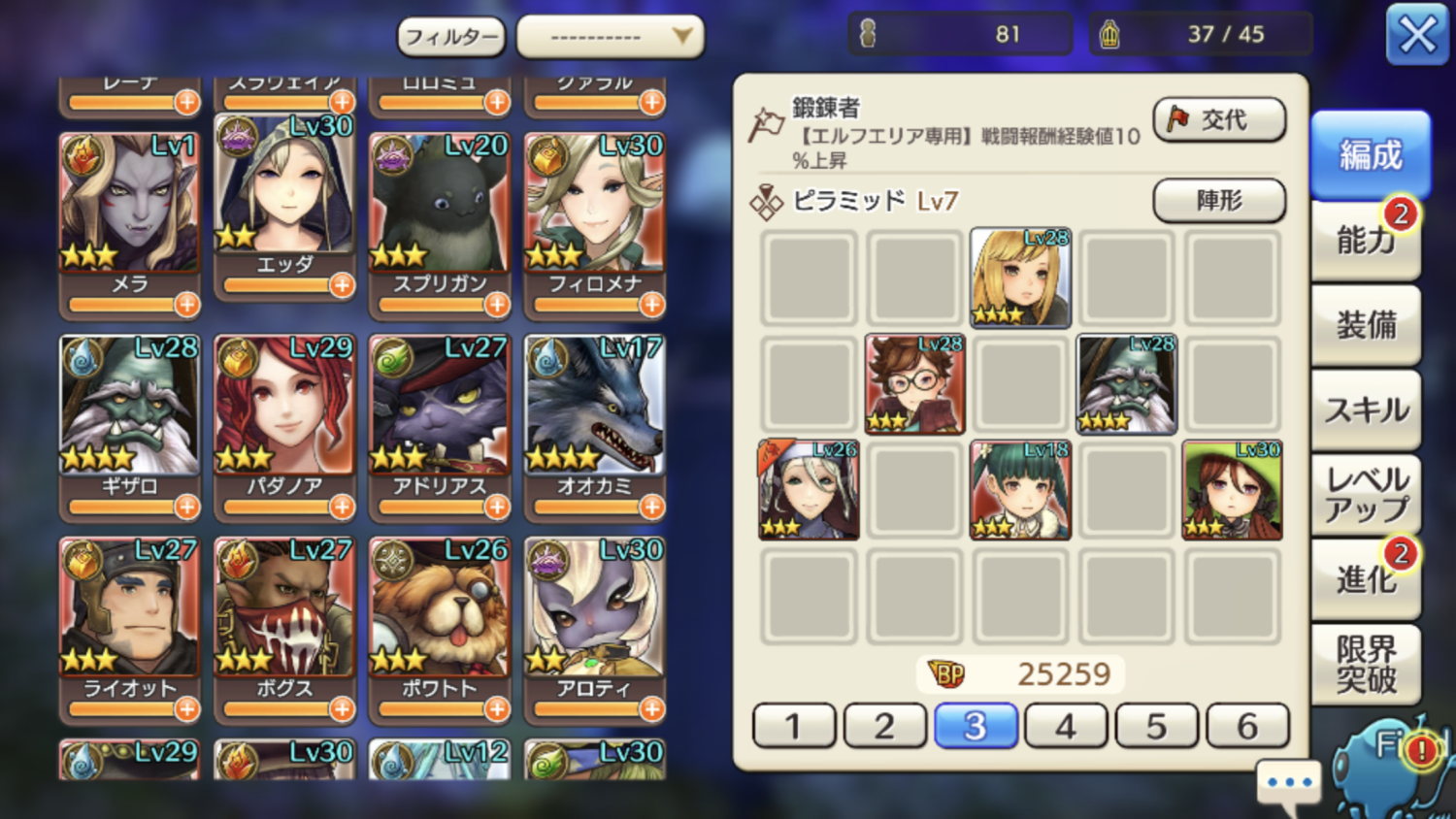真ん中、ロロミュ星3スキレベ共に1Lv18