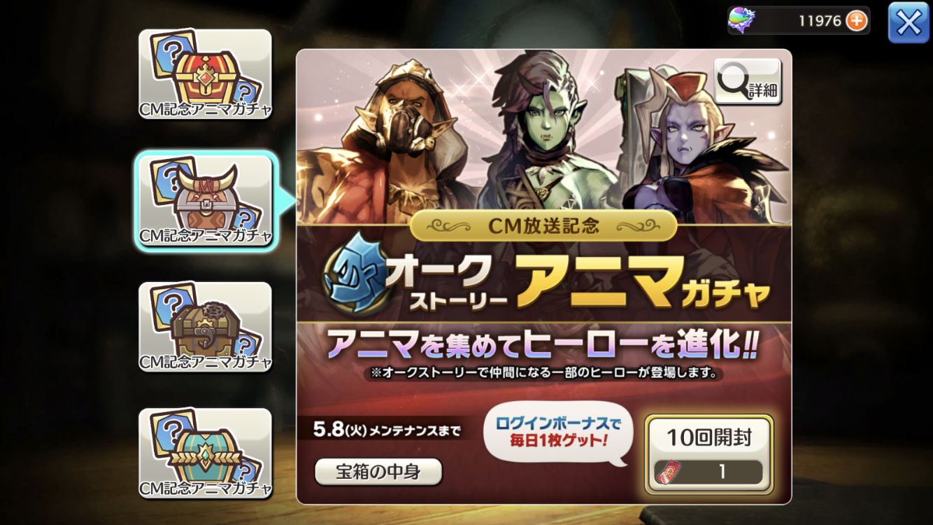 ガチャは4種族、ヒューマン、オーク、エルフ、ドワーフ