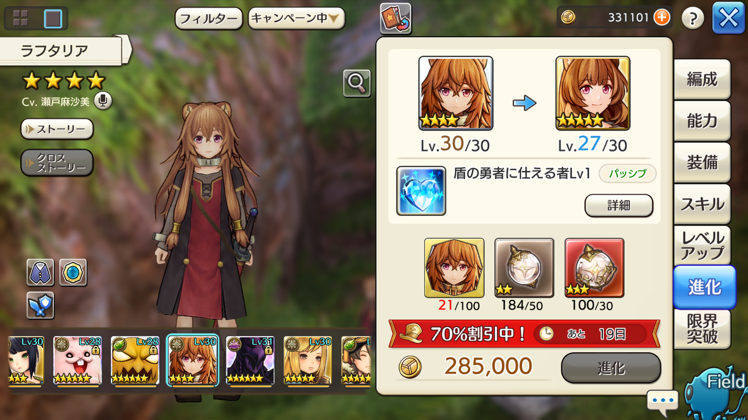 ラフタリアはストーリーで仲間にしてなんとか4進化、ここでアニマがきれいにゼロ。その後、盾のアニマチケットとキャラバン内タップで今アニマ21個。