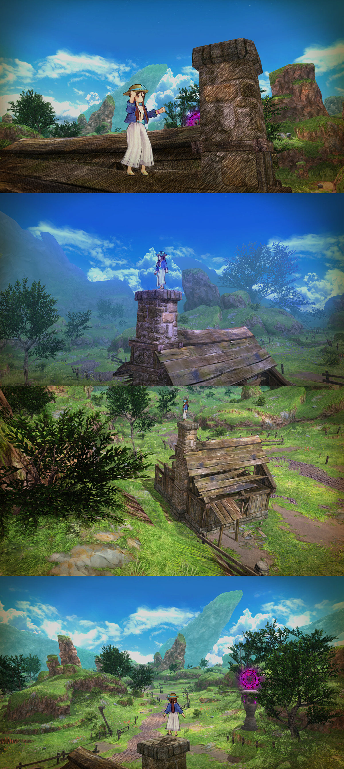 廃屋の軒(出っ張り部分)をタッチして飛び移って屋根に上がります。