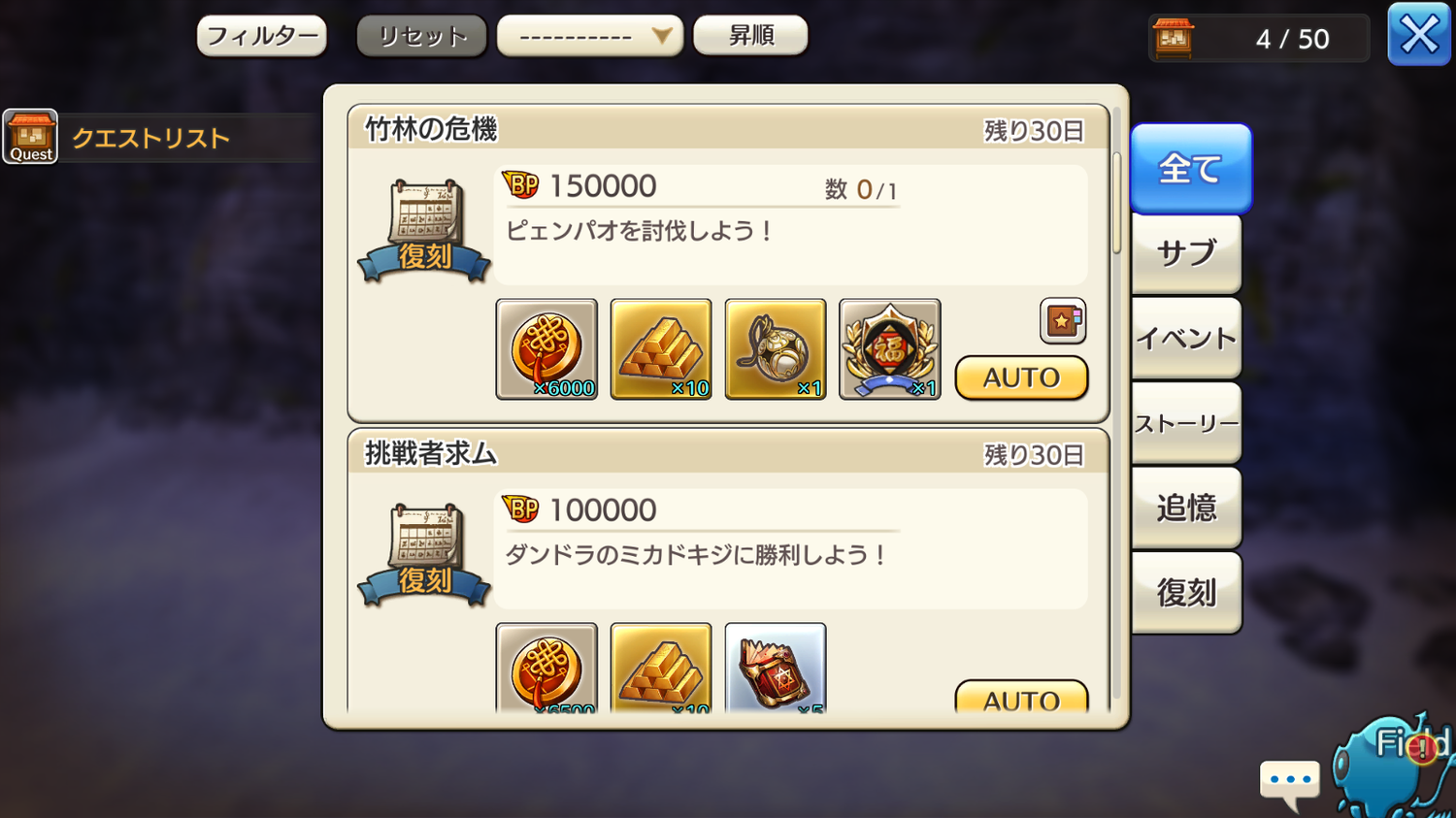 画面左のクエストリストのイベントタブを開くと普通は春節イベントが表示されますが、ニイ島に行ける土日にはクエストリストのイベントタブには春節イベントがあるはずなのに表示されずに、ニイ島のイベントだけになる。