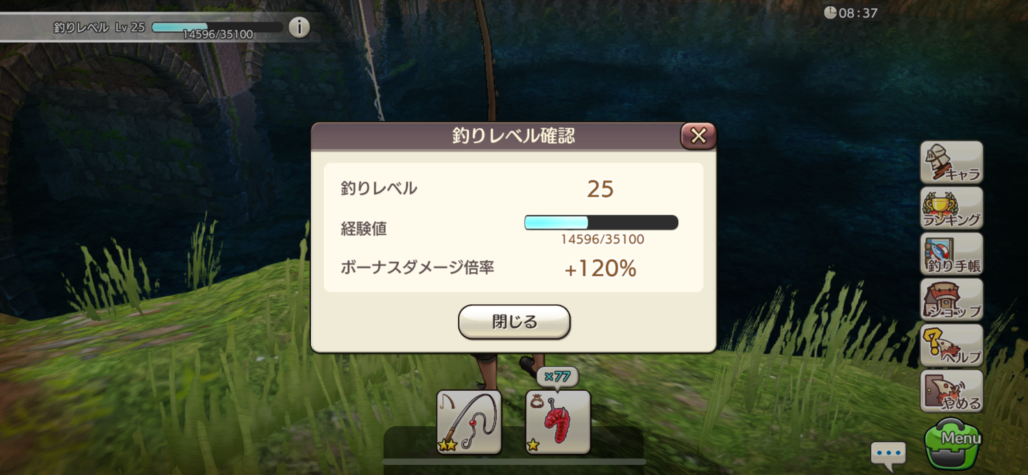 そうは言っても始まらないので地道に1日経験値2000くらいを目安に釣っております。これだと半月くらいで1レベル上がるのかな?この後さらに必要量上がったら知らないが…