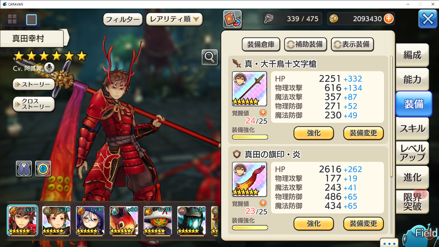 ☆5武器を大量にそろえた私は、武器合成で真田の☆6武器(メイン)を狙い、3回失敗、しかしこの3武器で真田武器(メイン)を無事作成。