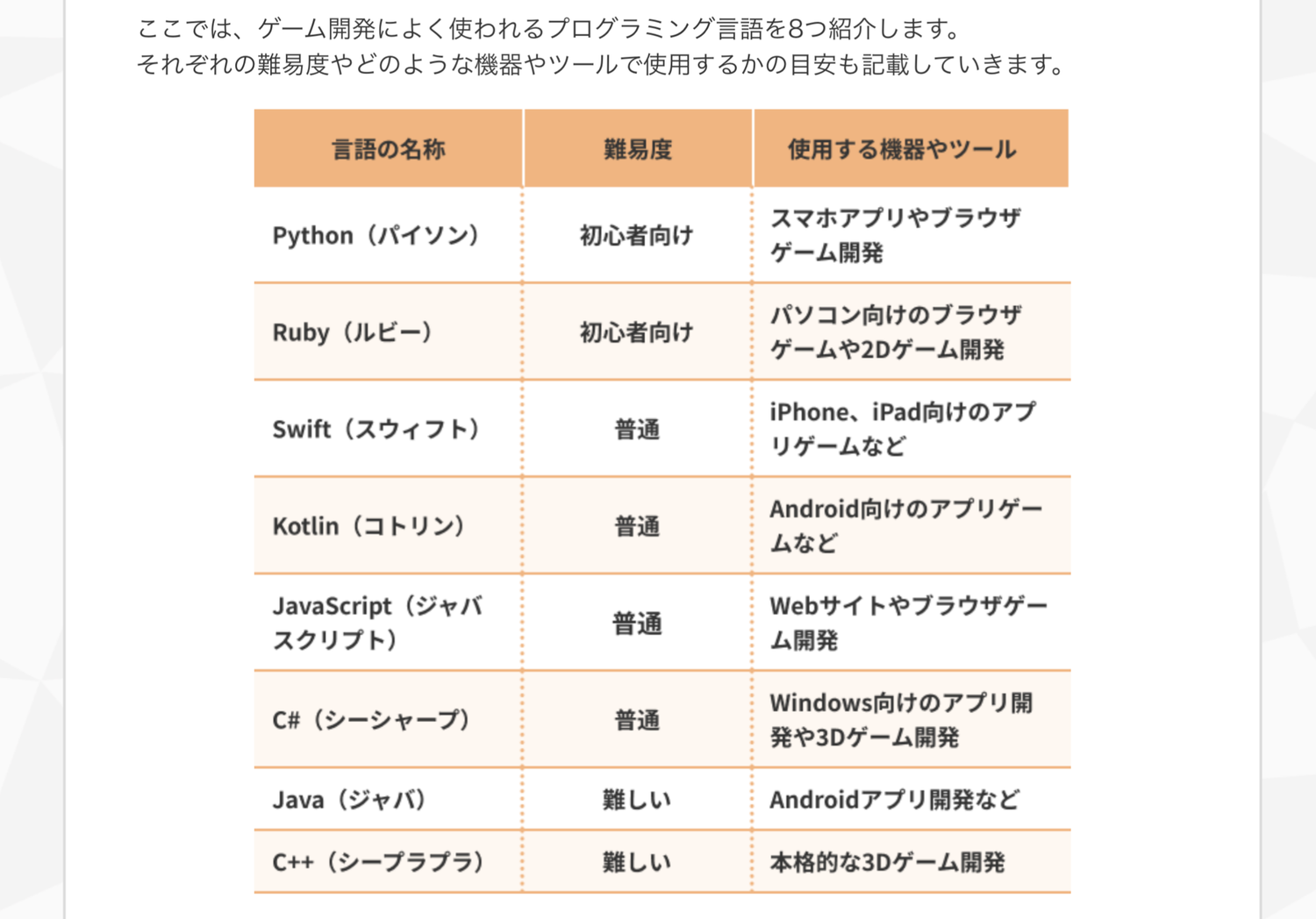※プログラミング言語と使用機器について、分かりやすく表にまとめてくださっているサイトを見つけましたので、ページ下に貼りました。