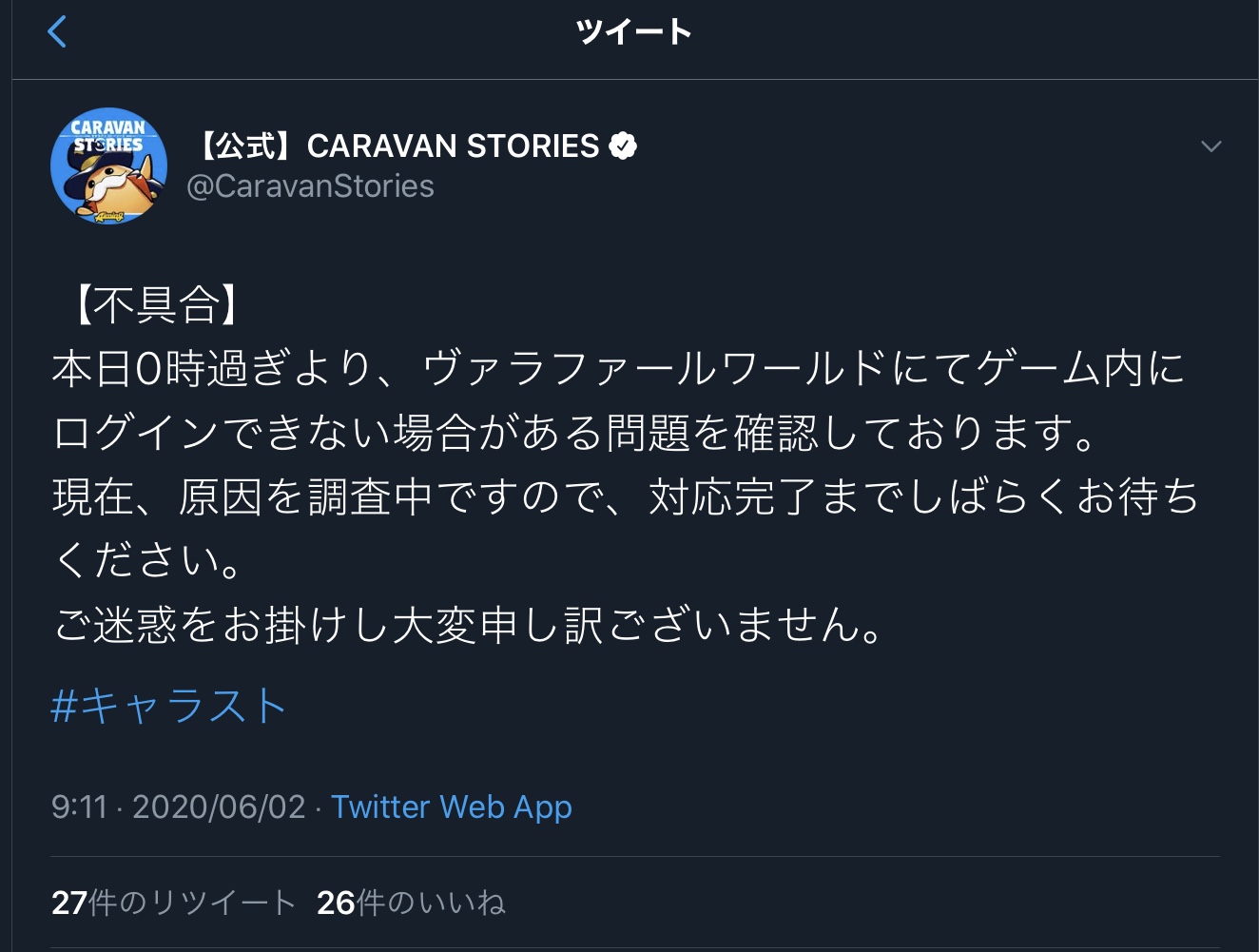2020/06/02 10:04 公開 ヴァラ鯖不具合 追加 このままメンテ? 雑日誌 https://twitter.com/caravanstories/status/1267609637852835841?s=21ポルカが今更つぶやいてます。まあ、それなりの補償きたいしてます。 はむ❖馬ぴょい リンクをコピーしました 前の旅日誌 旅日誌一覧 次の旅日誌 コメント 1 童子 ID: 7t9ipsf2xg3z ログインできない場合がある、ではなく「ほとんどログインできず、ログインできても移動したら二度とログインできません」が正しいですね。さらに9時11分ですかw。せめて1時台か、2時台には出さないとですね。補填は相当あると思います。なければ引退者続出するでしょうね。私もその一人になりますw 2020/06/02 10:10 2 テリーマン ID: ng88mmx34mqt 規約か何かに、ログインできない場合は、1時間につき100石あげます、といってほしい。 2020/06/02 13:01