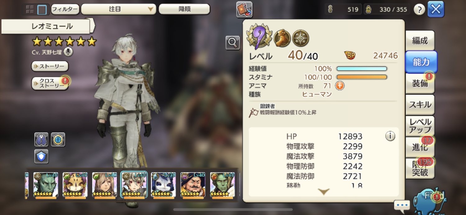 レオミュール…655レベル40 知力129 ダメ増44 ダメ減15
