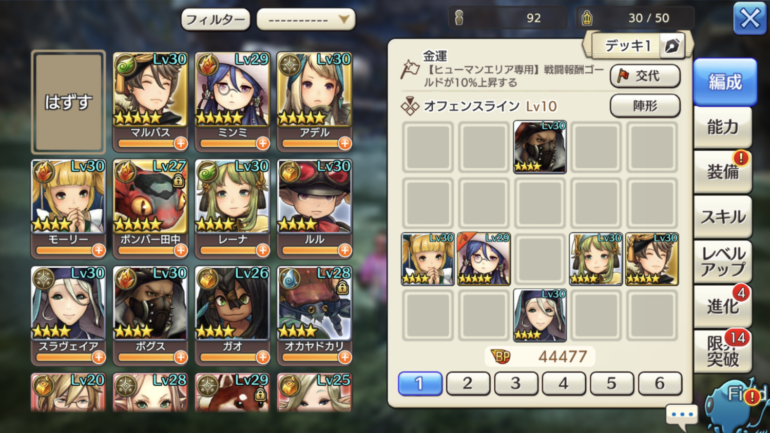 最初は頑固に耐久度重視で星5のヒュマアバを使っていたのですが、なかなか勝てない。吹っ飛ばし等の「陣形を乱す」敵に対しては、ヒュマアバは弱いのだ( ˘•ω•˘ ).。oஇ