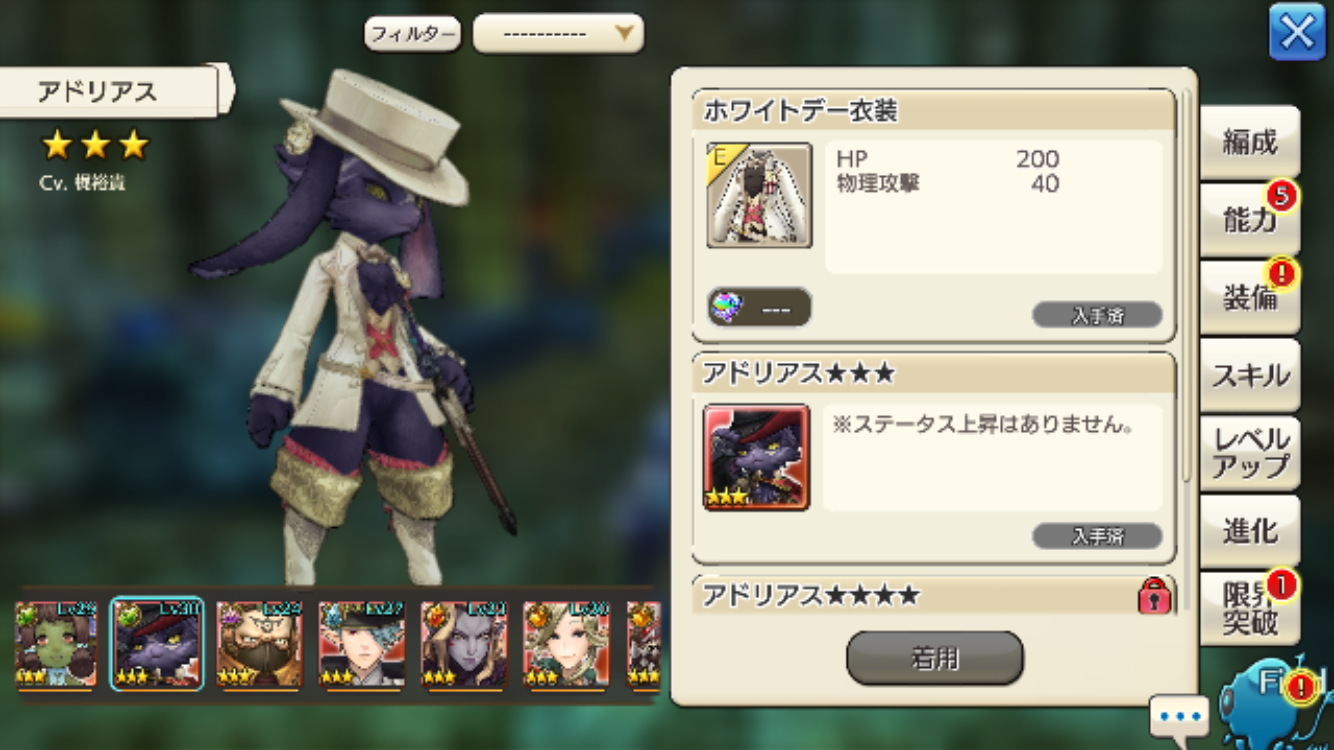 2018/03/16 20:48 公開 ホワイトデーアドリアス(*´w`*) 雑日誌 初心者 とっても可愛い!!出来れば、クリスマスアロティちゃんも欲しかった。。。復刻版とかないかなぁ。。。あ!アドリアス星4になりましたー(*´w`*)キャラバンのゴールド製造機?を強化するのを忘れてて、強化して星4キャラ増えました!ジリアン、ソフィア、アルメイダル、アドリアス!!ヤッタァー!!でも、ウドンのキノコぜんっっぜん倒せない。。。_:(´ཀ`」∠):_強化あるのみです!!!!!! frogerヨノ リンクをコピーしました 前の旅日誌 旅日誌一覧 次の旅日誌 コメント 1 ダリウス ID: 35f5jw3casdi ブルーキャップの事なら、クリアできるかも。(^^ゞ私は☆4ソフィア、ダメ減少1個だけ。☆4メイン装備交換で無し。ソフィア以外☆3Lv25位でした。なお、フィロメナ回復はアクティブレベル4欲しい。回復継続が途切れなくなるため。オフェンスラインLv 4以上だったかな前列ソフィア左側からミンミ、フィロメナ、スラヴェイア、私はパダノア(アルメイダルの無敵で楽になる。)後列アメリア(挑発耐性レベル2。他の耐性も上がるため必須)です。開始前に、Autoは切り。手動で次の操作をします。。最初に、継続回復のため、スラヴェイアはソフィアにターゲットする。次はアメリアもソフィアにターゲット合わせ、ソフィアHP半分でアクティブ発動が必要でした。無敵は、キノコ投げる前、振り撒くに発動すると良いようです。(^^ゞ 2018/03/16 21:18 2 frogerヨノ ID: k5yt6idpxgp6 >> 1 ご指導ありがとです、マスター!!!(*´w`*)なるほど、ちょっと私のメンツだと私まだまだ強化が必要そうです!!オフェンスラインレベル1なのです。笑ソフィアとアルメイダルはなんとかいけそうかなぁ。。。 2018/03/17 15:53