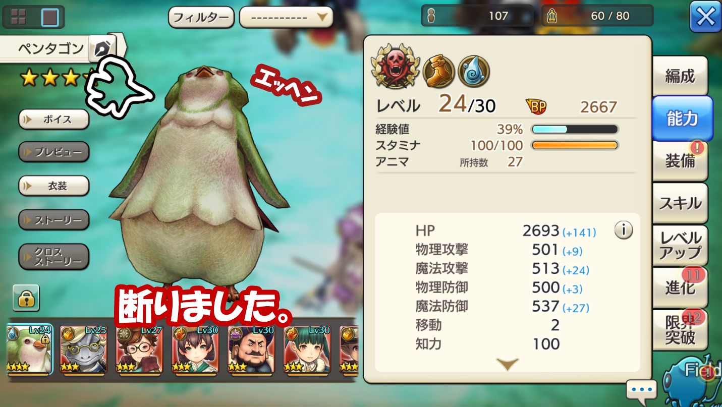 2018/08/16 02:34 公開 突然変異がきた!! 雑日誌 スクリーンショット 始めた時から一緒のペンタゴン(ペンギンです)。頑張って頑張って、大事に大事に育ててきました。手塩にかけて育てたペンタゴンが、なんと。突然変異をしたいと言い出しました。そう…キミは、コウテイペンギンになりたいのですね…。子供はいつか、親元を去るものですよね…。だが断る。ペンタゴンは、ペンタゴンのままで可愛いから、このままでいいです。 儚幻 リンクをコピーしました 前の旅日誌 旅日誌一覧 次の旅日誌 コメント