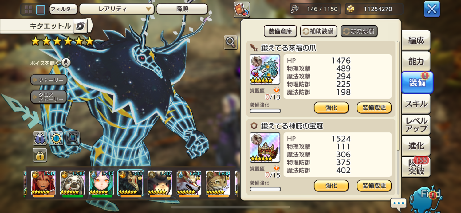 一応☆6のレベル30ですが、スキルはオール1、ルーンなし、補助装備なしの生まれたままの素のキタエットルさんです。舐めすぎですか?そうかも…