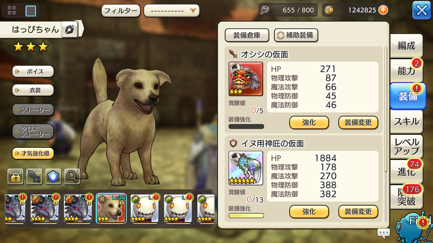 わーい、シバイヌちゃんから半年ほど遅れて・・・・・・ようやく、わんこちゃんの☆6装備、おみやげでいただけましたぁ!きゃっきゃ!! ※覇王マンティ産