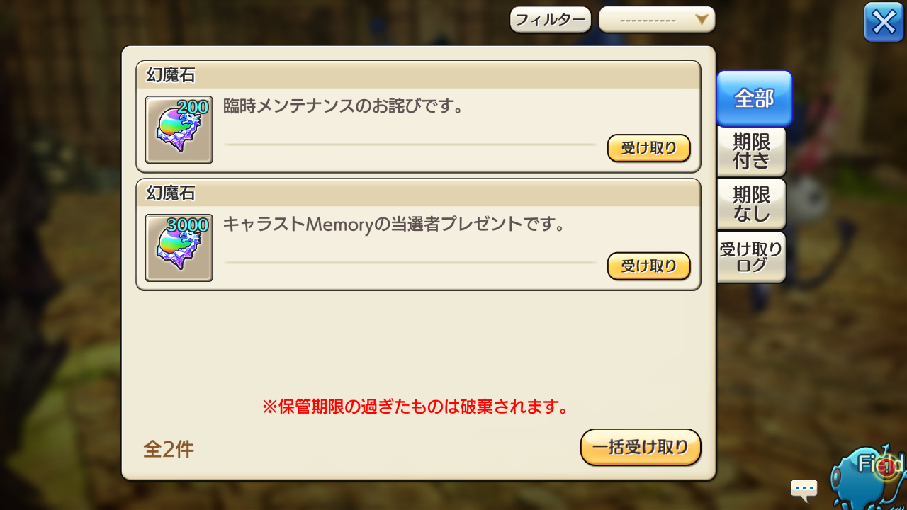 昨日の旅日誌はメンテ中に書いてたのですが、メンテ開けにプレゼントBoxみたら「キャラストMemoryの当選者プレゼント」をもらっていましたっ(*´∀`*)