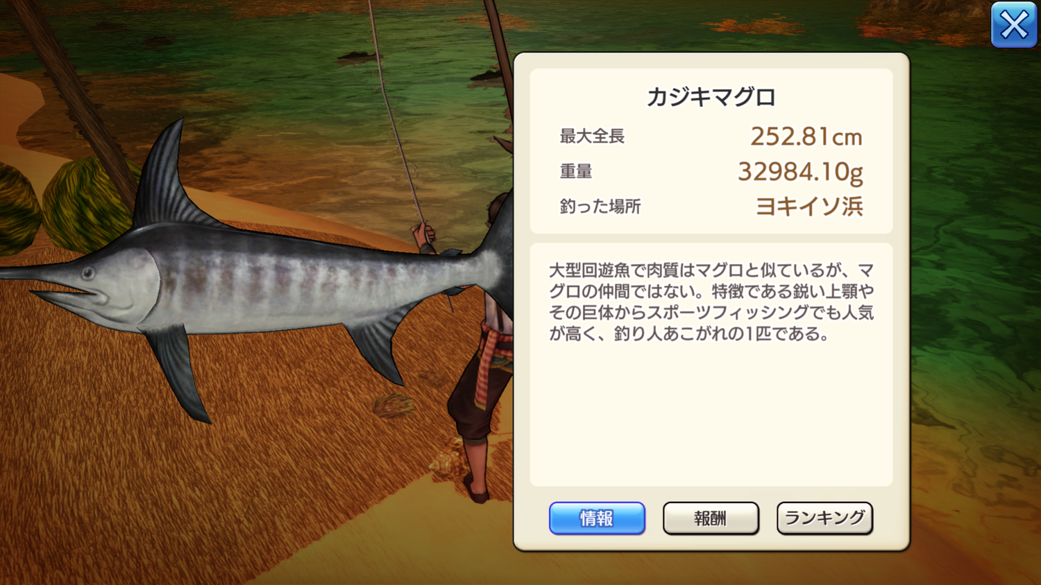 2023/08/19 08:03 公開 魚はこれが精いっぱいかも カジキマグロって難しいですね。最後の最後で逃がしてしまう。これが自分には精いっぱいかも。252.81cm追記最近、朝ログオンできないことが多く時間を早めにして対応していたのですが今朝は時間を変えて見ても入れませんでした。夏休みで混みあっているのでしょうか。 白兎 リンクをコピーしました 前の旅日誌 旅日誌一覧 次の旅日誌 コメント