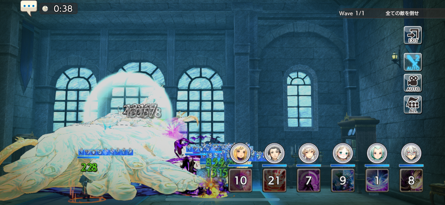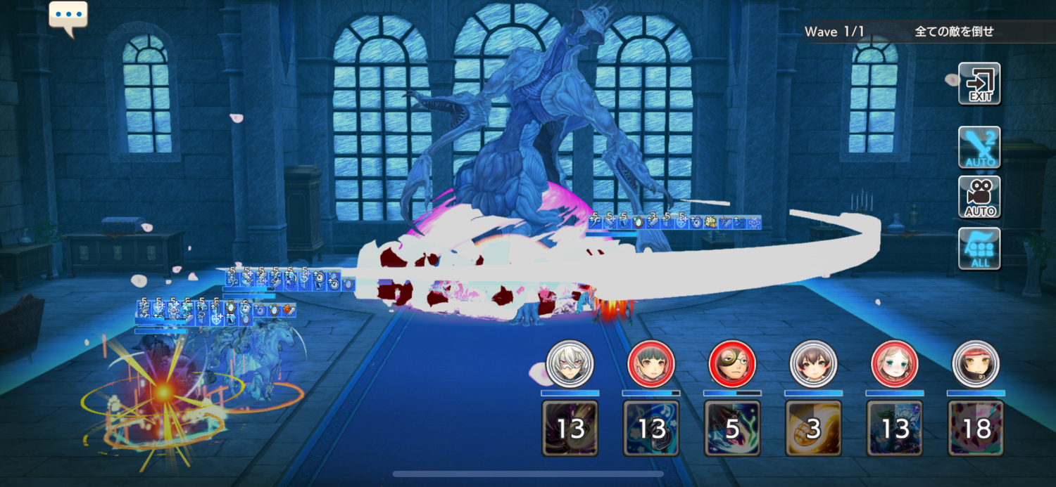 ダメージに対して回復される量がエグくて倒し切れない。聖閃の凍結中に削りなおすが間に合わないためジルニトラ(ストップ要員・ダメージはエッダで行うのでスタン・ストップ誰でも良い)入れたらダメージが回復量を上回った。リトライなし。