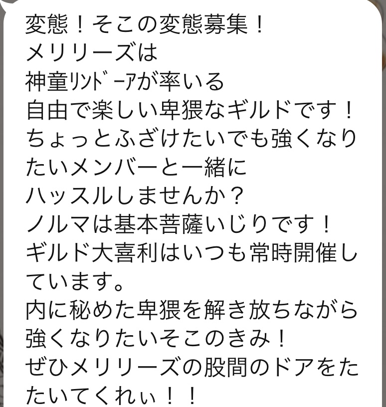 2021/05/30 20:42 公開 ギルドメンバー募集しています? ギルドメンバー募集 タイトル通りです。具体的には画像をご覧くださいm(__)mああ、でもほとんどが普通の人ですけどね。子育てママや子育てパパが多いです。興味があれば、ぜひ。申請お待ちしております。 リンちゃん リンクをコピーしました 前の旅日誌 旅日誌一覧 次の旅日誌 コメント