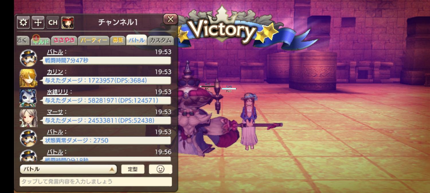 5戦目はカリンが余裕で耐えていたので、後衛まとめてガラッドバフ乗せてひたすら攻撃しました。こちらも時間ぎりぎり(+_+)