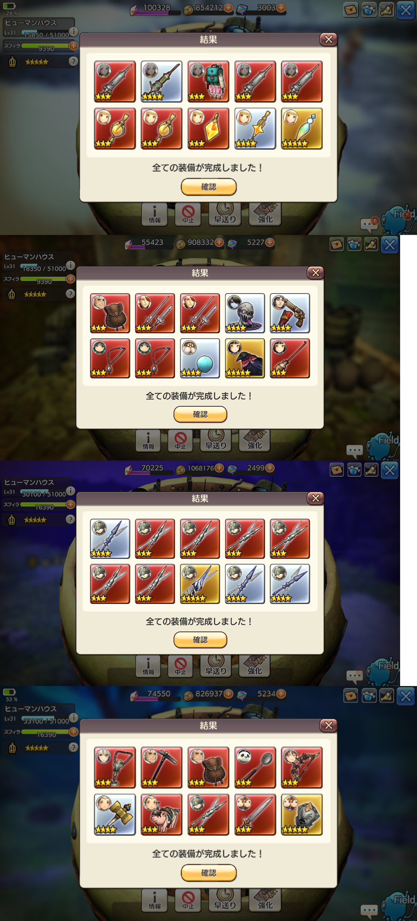 装備ガチャ10-20連を毎日回しているようなものなので、12月の☆5装備は合計5個、1月はすでに3個も出来ていたりします(≧∇≦)ノ