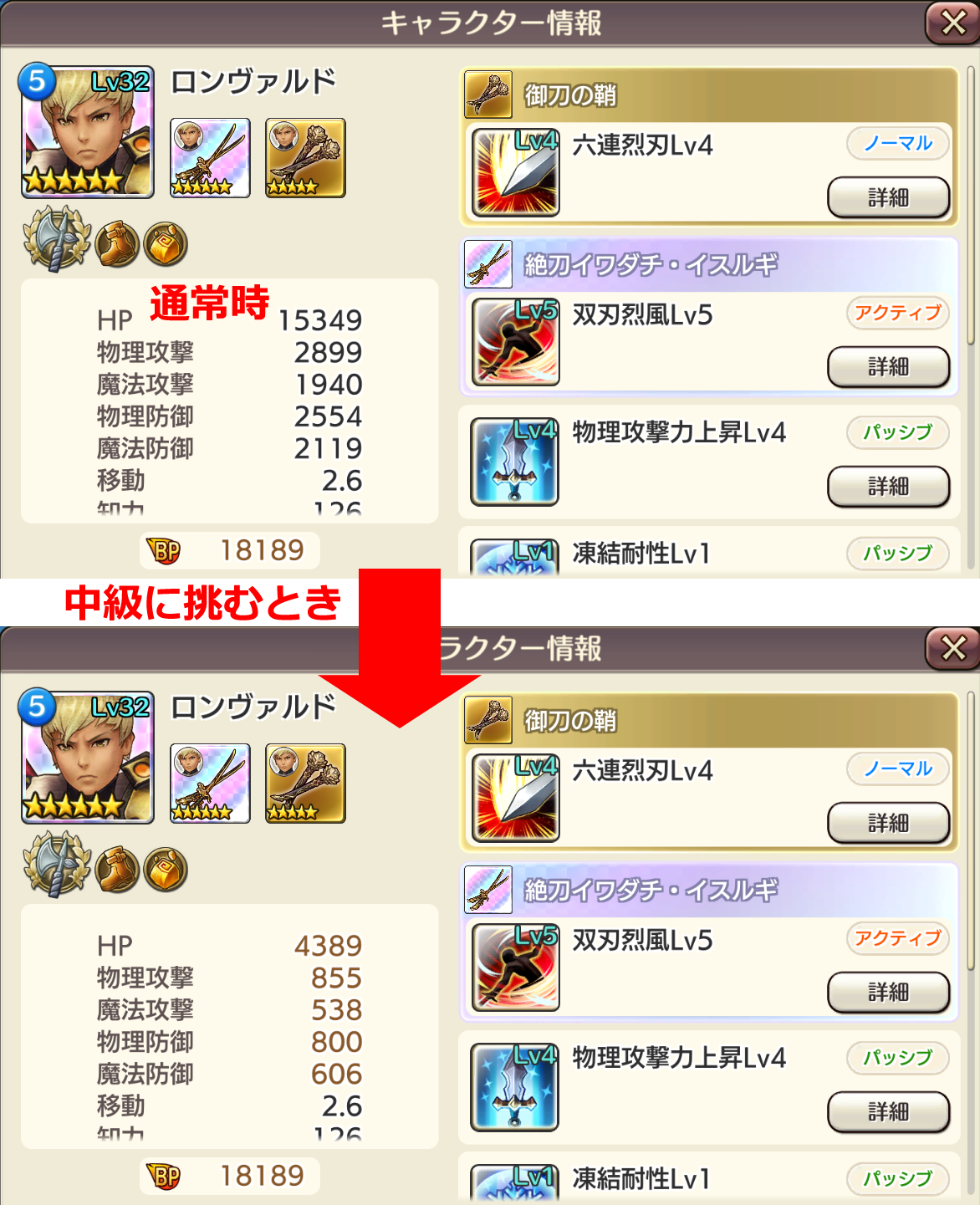 まず、バトルに行く画面の右の難易度のドロップダウンメニューで中級とか上級を選びます。これで報酬が確認できるだけじゃなくて、その状態で「デッキ」ボタンでデッキ組む画面に進んで左側のキャラを長押しして表示されるのがステ下げされたステータスです。
