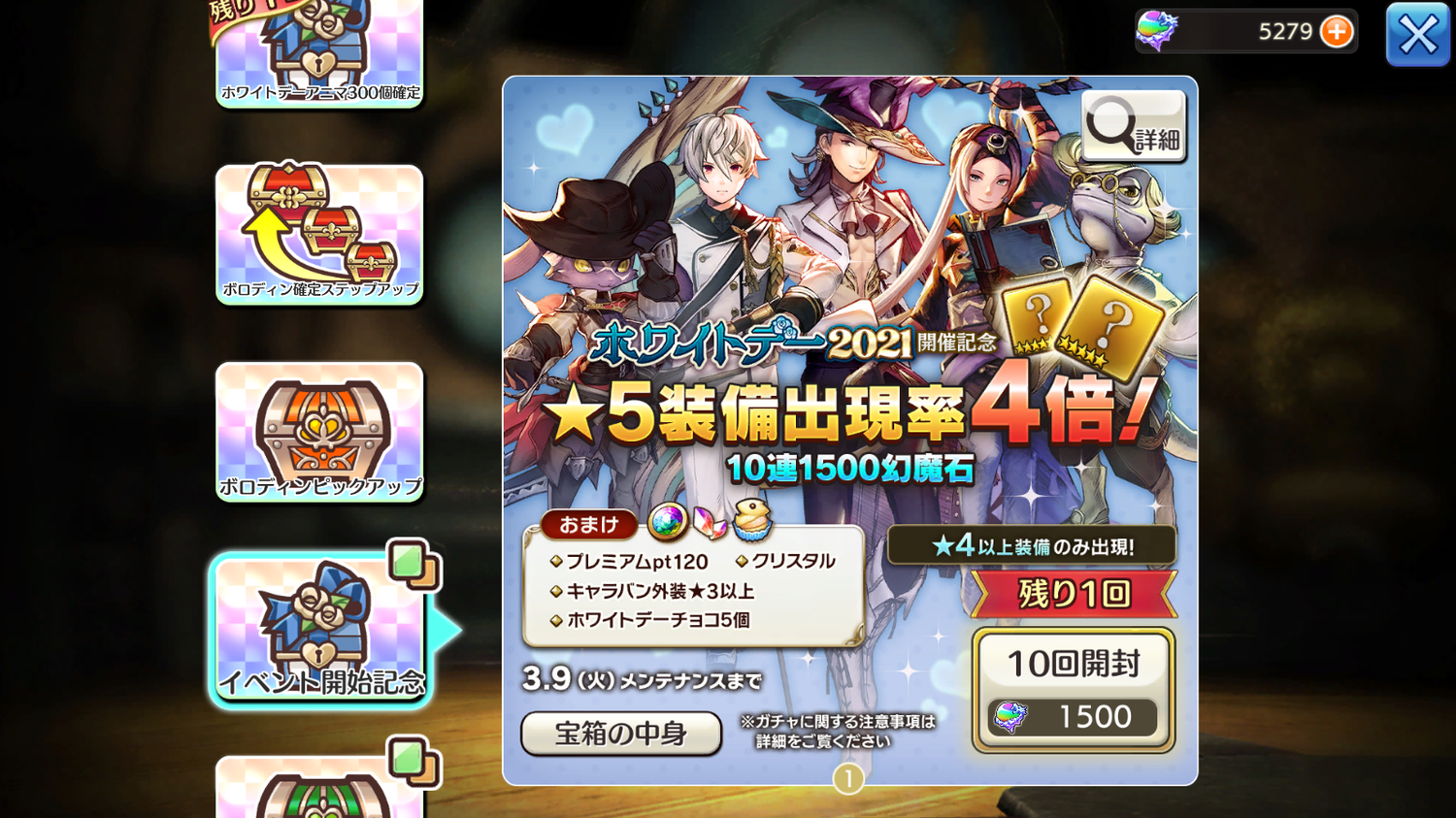 2021/03/04 19:42 公開 1500石の星4武器ガチャにホワイトチョコが付いてきますよ! 雑日誌 500石のほうはすぐ買いましたが、1500石の方はちょっとお高いんですよね。何といっても星4武器しか出ませんし。でもチョコ入手方法がないので、購入っと。ファ!?ガチャのテーブルを間違えていたようですね アグラヴェイン リンクをコピーしました 前の旅日誌 旅日誌一覧 次の旅日誌 コメント 1 キーダイ ID: nwu2wdcnw688 まぢで4倍やん! 2021/03/04 22:42 2 春@末端冷え症♡ ID: 9c76dexf989n 素敵♡(∩´∀`∩)そしてこれに味をしめて、次のイベガチャで回すと出ないという。。。よく出来てますw 2021/03/04 23:10 3 ttr元祖の元祖 ID: fkeea4d8hzj5 アグさんのガチャぶっ壊れ(・∀・) 2021/03/04 23:14 4 アグラヴェイン ID: hrtjv2ztg34b 餌(チョコ)が付いてないと回しません(キリッ 2021/03/04 23:28