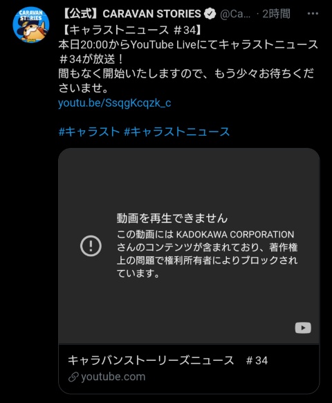 コラボ特設ページのPVは見られるし、アーカイブ直後に「KADOKAWA著作権の問題で~」と表示されたので多分YouTubeAIによる誤BANの可能性が高いです。